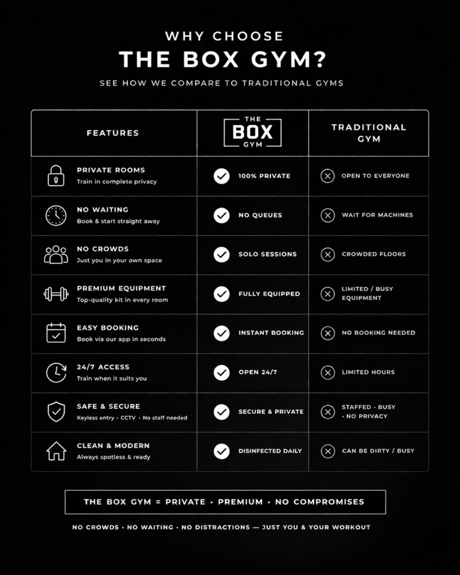No crowds. No waiting. Just you and your workout.